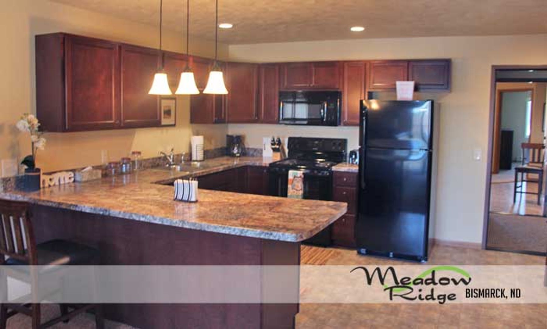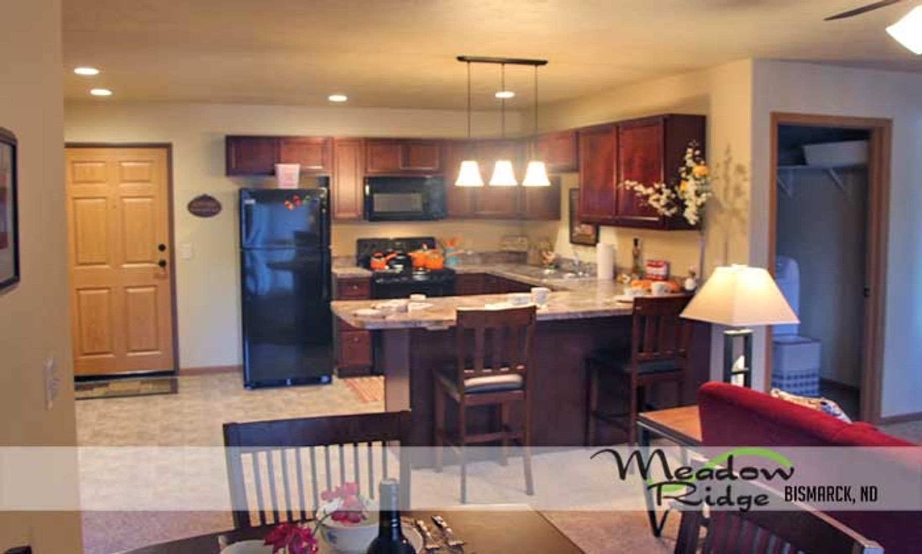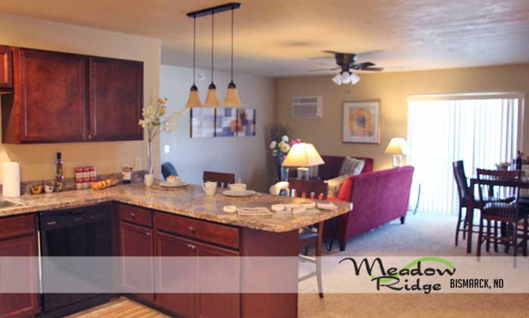 Beautiful Newer Two Bedroom Apartment Homes in Bismarck at a great price! Meadow Ridge Apartments in Bismarck offer endless amenities apartments are stunning and ready to move in! You can't pass up the hand-selected fixtures, spacious laundry room, walk-in closets in both bedrooms, granite counter-tops, 24 hour surveillance, & a Fitness Room!